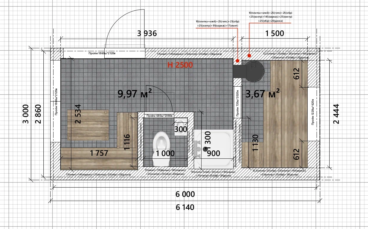 • Черновая отделка в зоне душа:Стены- Влагостойкий гипсокартон 12,5мм, до потолка.