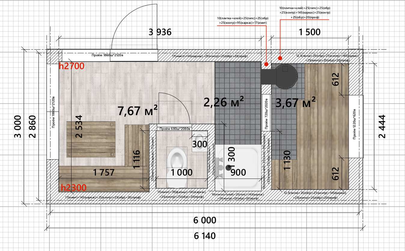 • Черновая отделка в зоне душа:Стены- Влагостойкий гипсокартон 12,5мм, до потолка.
